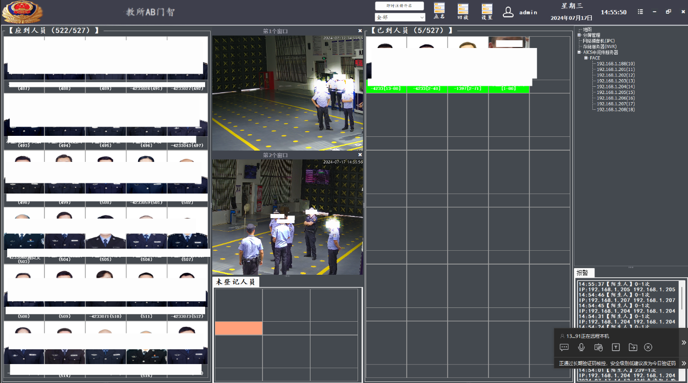 案例簡述:智慧監獄無感車間人臉點名播報系統,是專門針對監獄、監所、監舍、車間生產場所及大樓出入口等場景量身定制的一套點名系統解決方案:實現監管場所出入口人員管控,可做黑、白名單比對和區域布控報警提示。可采集、提取并記錄存儲監測區域內人員(犯人、警員及外來人員等)人臉特征信息和圖片行動軌跡。代替原有的手動點名的工作,提升勞動效率,無需離開工作崗位,實現無感人臉點名,支持定時點名、手動點名多種點名方式,能夠減少獄警點名的工作量。