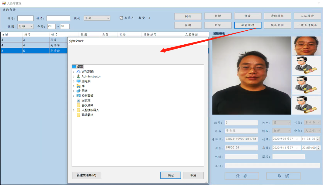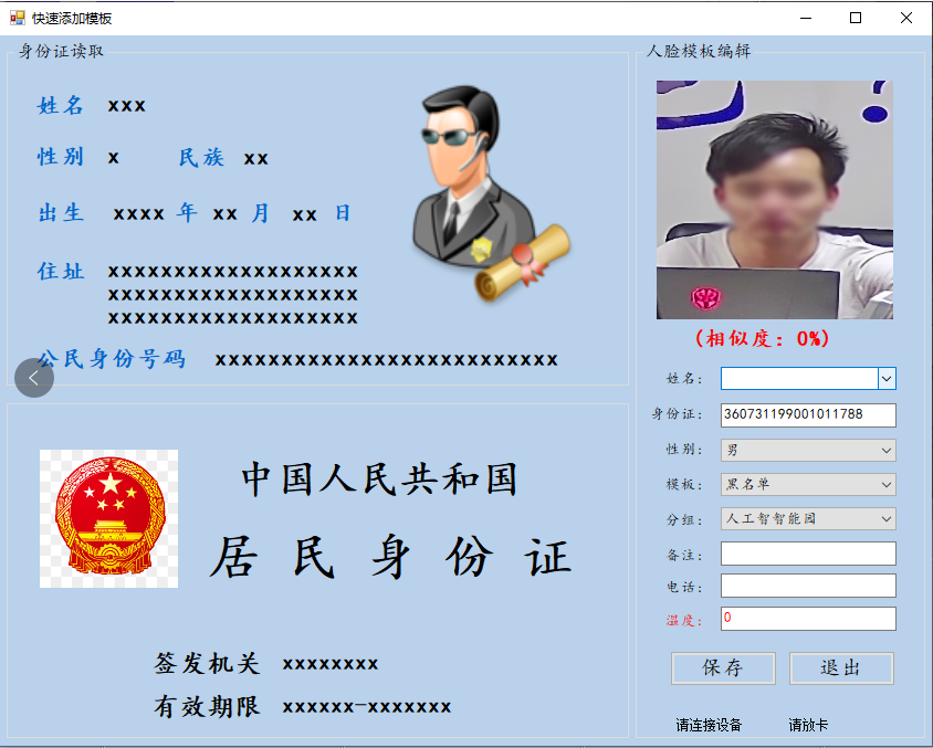 部分模版照片殘缺情況下通過陌生人實現快速模版補錄問題,姓名錄入處可以下拉選擇所有照片不正常的列表,無需現場錄入其它數據。可選現場采用外接人證核驗機對現場抓拍的外來訪客進行實名登記(需加購身份證讀卡器)。