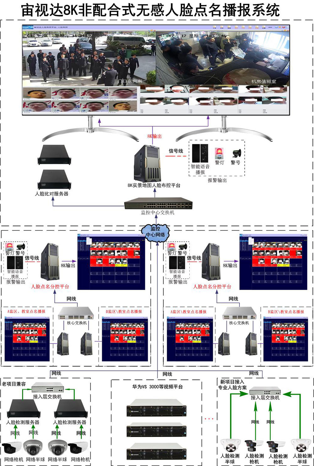 無感人臉點名播報系統是專門為司法領域、會議場所、學校宿舍以及學校班級等場所大樓出入口、教室,會議室、生產區域等場景量身定制的一套解決方案,通過人臉檢測攝像機、人臉比對服務器、人臉布控平臺、人臉點名分控平臺及人臉點名播報等軟硬件技術,實現非配合式的無感點名播報功能,全面優化與改進目前配合式點名影響工作效率,現場操作十分繁瑣等問題。